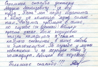 Пять лет назад мы обратились к нему в очень сложной ситуации: муж злоупотреблял алкоголем, начались серьёзные проблемы в семье и на службе (он военнослужащий). После проведённой кодировки жизнь кардинально изменилась — в семье восстановились спокойствие, любовь и взаимопонимание. Муж достиг успехов по службе, получил повышение и находится на хорошем счету у командования. Вообще, все хорошо. Большое спасибо!